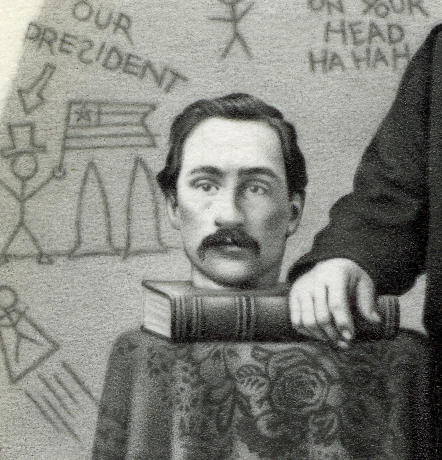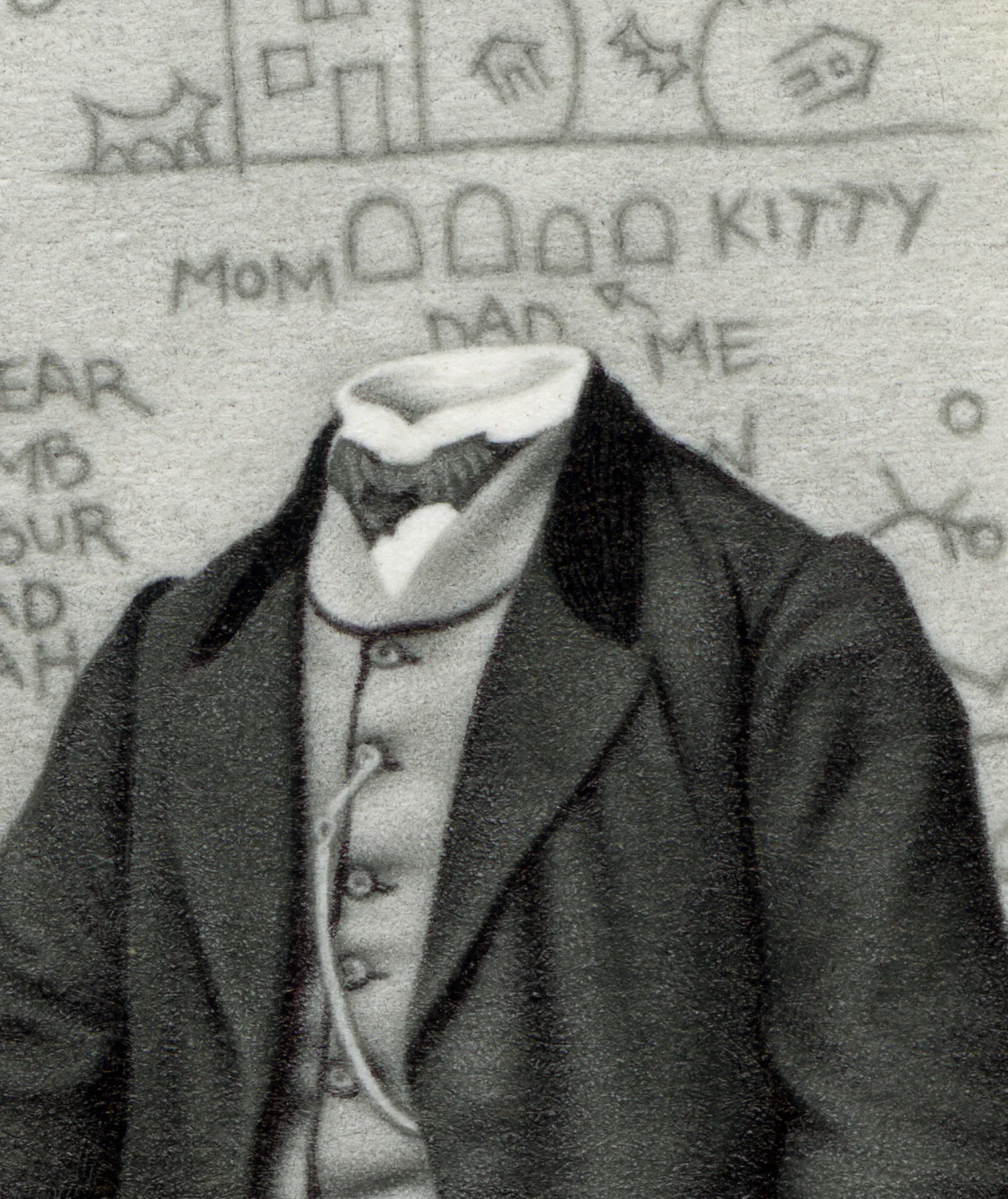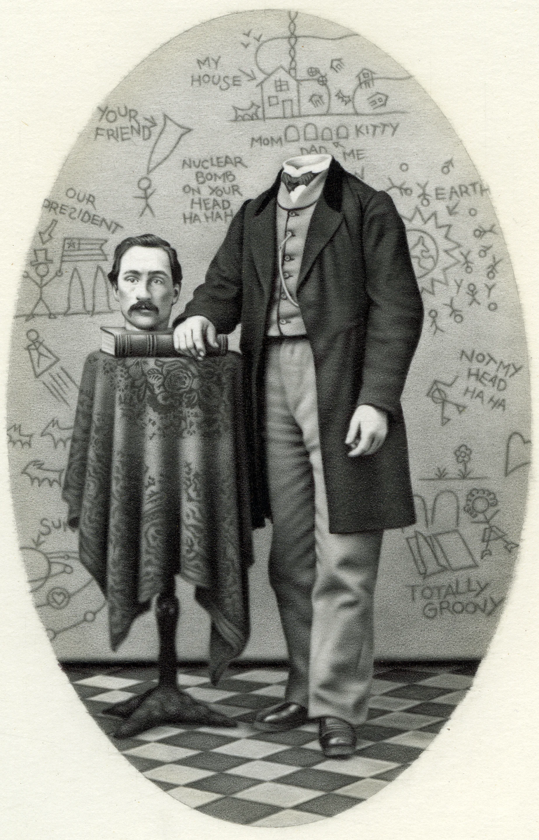 This is a miniature 3.5 INCH drawing rendered with a mechanical pencil holding 2 mm graphite leads from 8H to 4B, along with a black ballpoint pen. The original inspiration for this figure was a young man of the 1860’s who was photographed in a skylight portrait studio and then printed on a Carte de’ Visite which I came across in a secondhand store 100+ years later. The original motivational basis for removing his head and adding graffiti to the background was too counterbalance the monsterous minds in Washington DC, namely Ronald Reagan and George W. Bush Sr., who were in the news for Contra-Gate, supplying Iranian terrorists with weapons, jets, bombs, etc., as a trade-off for keeping the hostages hostage and not releasing them to President Jimmy Carter {see Barbara Honegger’s book October Surprise}, for training and arming death squads in Central America, for shipping weapons to Terrorists in Central America in exchange for CIA planes full of cocaine being imported through Mena, Arkansas {see information related to Hasenfus plane crash and calls to GW Bush Sr.} and of course the expansion of the Nuclear Cold War paranoia with Russia. So alas, with all this info relative to the criminal rogue element in Washington DC, how could I remain, or anyone remain silent?