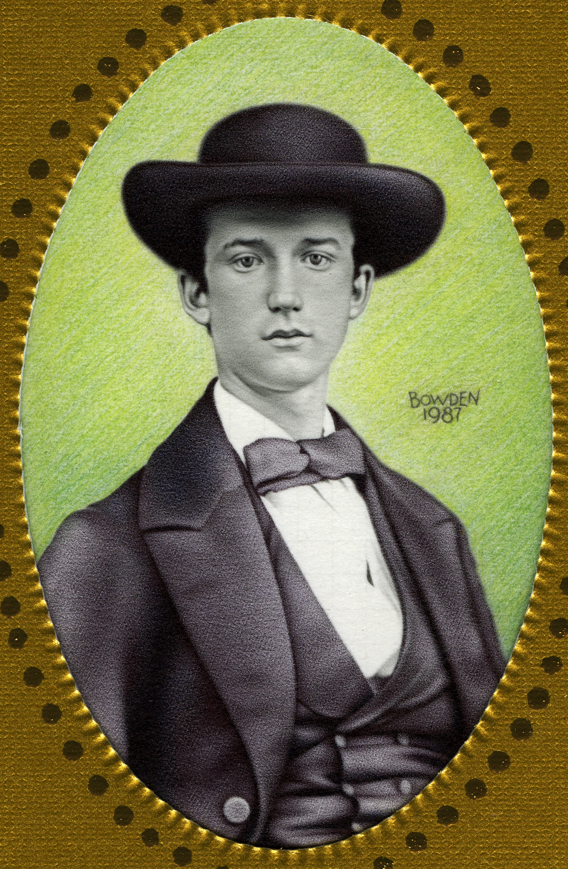 This is a miniature 2.875 INCH drawing rendered using a mechanical pencil holding 2mm graphite leads from 8H to 4B, along with various colored ballpoint pens. The original inspiration for this drawing was a young man of the 1850’s who was photographed in a skylight portrait studio on a wet plate Collodion silver sensitized glass plate and presented as an Ambrotype, which I was to purchase at a secondhand store 130 years later. During this phase of my technique evolution, I was still refining and understanding the precisionistic potential of this medium in conjunction with color.
