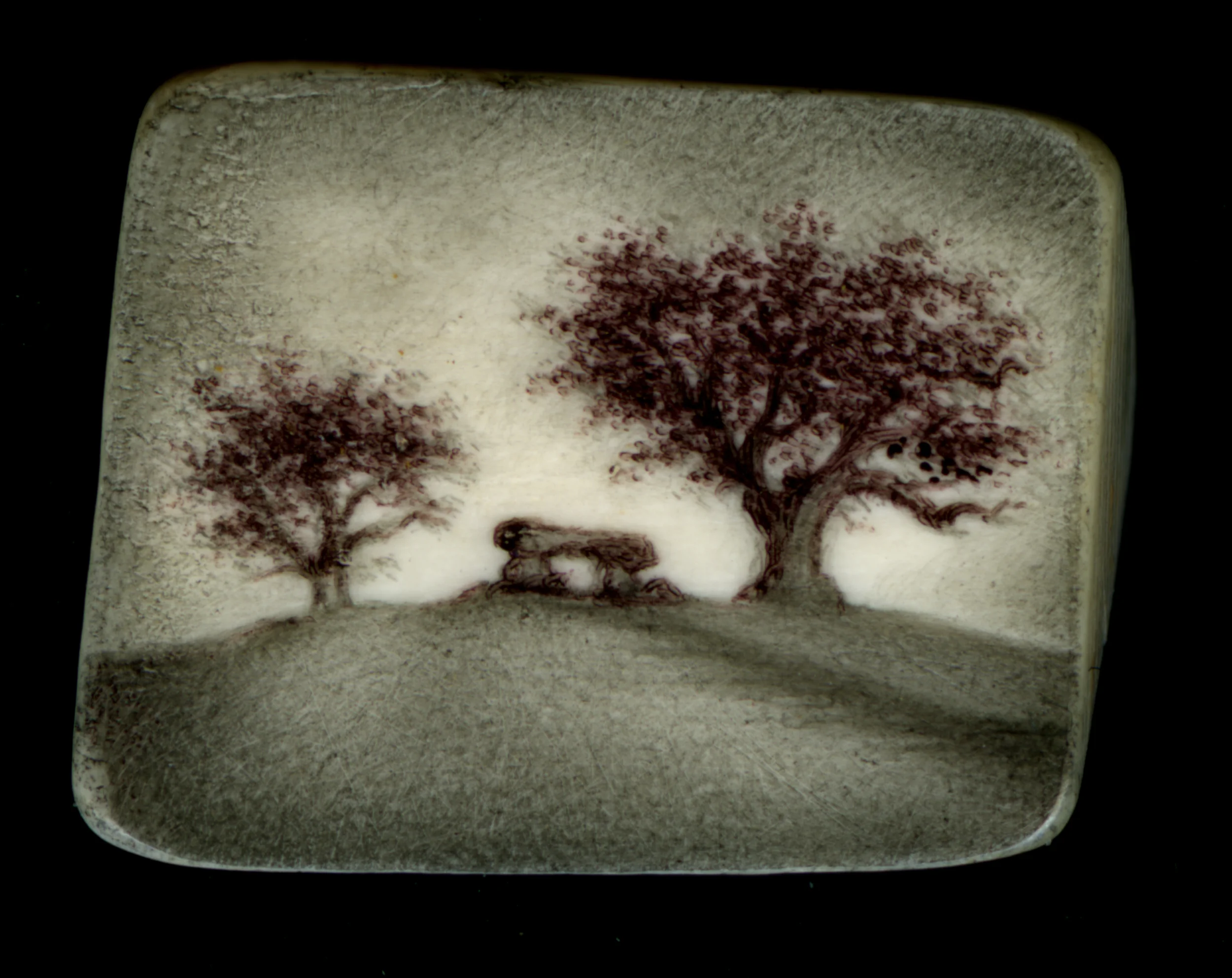 Stone Bench & Tree, pencil & Ballpoint Pen Drawing (on Fossilized Ivory), 2007, 3/8 x 1/2 inch